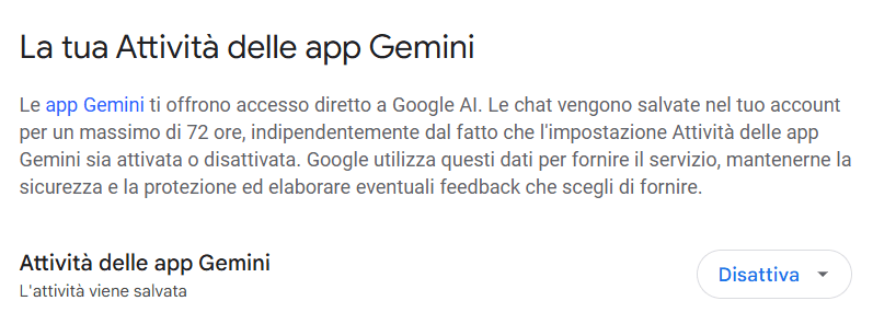 - Clicca questo link per accedere alle Impostazioni Google delle tue attività Gemini
