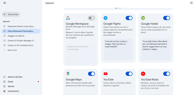 A questo punto, potrai attivare le estensioni delle applicazioni che vorrai utilizzate dentro il tuo Gemini: