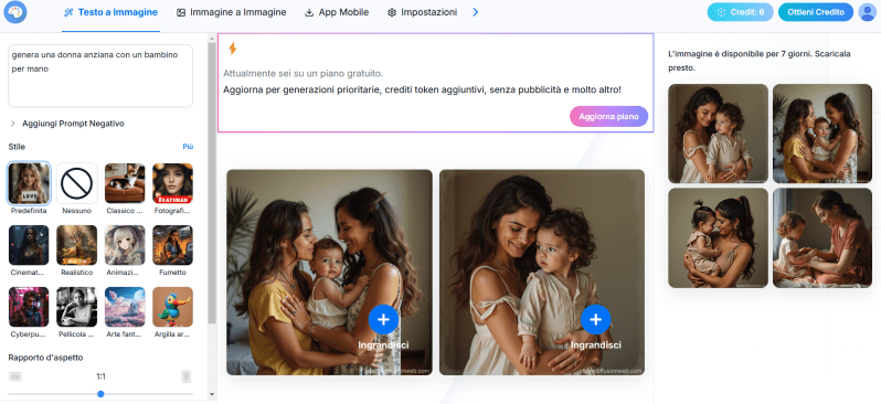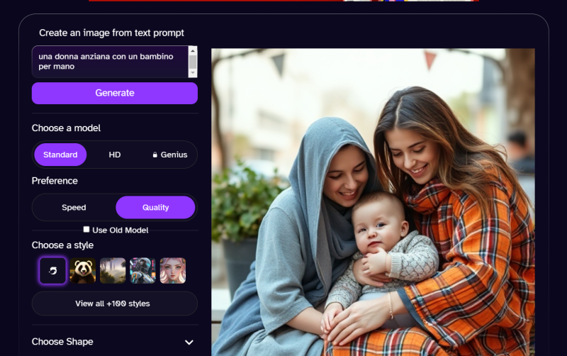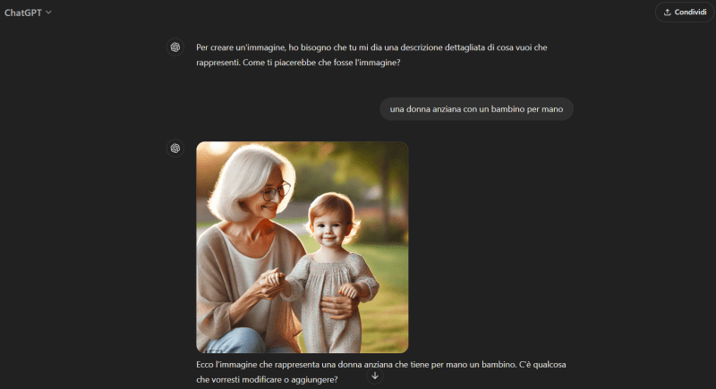 Tips! Come puoi vedere dall’immagine sopra, la risoluzione è incredibile, ma non rispecchia esattamente il prompt. Ti consiglio di utilizzare la lingua inglese e di dettagliare al meglio il prompt (nel mio caso è bastato scrivere “A granny with her nephew” per generare il risultato desiderato).