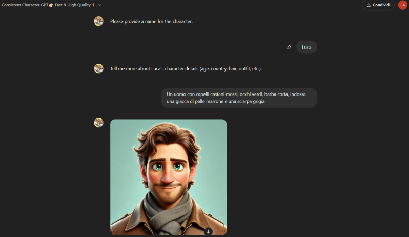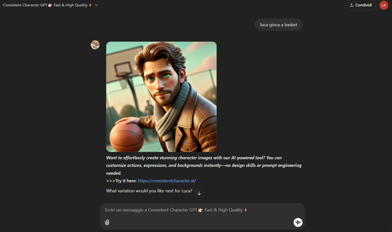 A questo punto potrai definire quali altri azioni/scenari deve comparire il tuo soggetto. ChatGPT cercherà di replicare le stesse caratteristiche. Ecco un esempio: