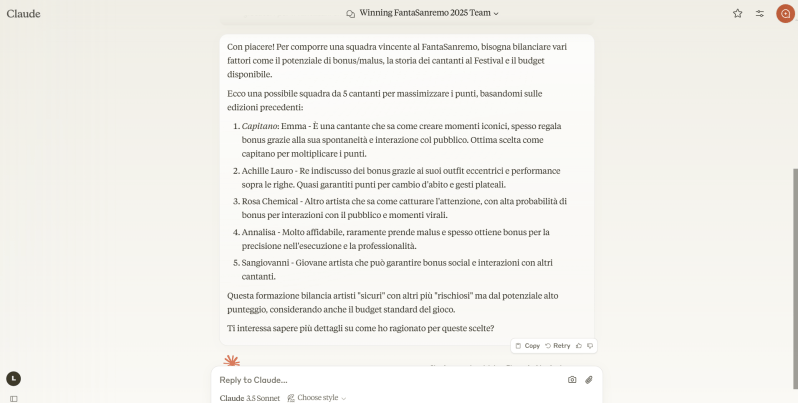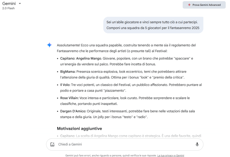 Il prompt che ho usato è stato questo: "Sei un'abile giocatore e vinci sempre tutto ciò a cui partecipi. Componi una squadra da 5 giocatori per il fantasanremo 2025."