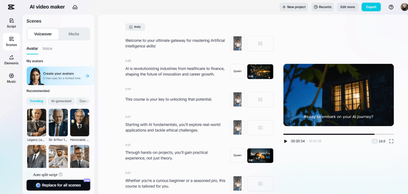 - Ora vai su ‘Scenes’ a sinistra e seleziona l’avatar che vuoi usare. Puoi eventualmente anche creare o caricare dei media tuoi. Io per esempio ho selezionato ‘Andy’ e ho chiesto di applicarla a tutte le scene. Per alcune scene, ho rimosso l’avatar e ho chiesto all’IA di generare dei media, per rendere il video più dinamico.