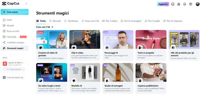 - Una volta effettuato il login, seleziona ‘Strumenti Magici’, dove potrai vedere tutti gli strumenti AI che puoi usare per i tuoi video, come la generazione dei video a partire da testo o strumenti di video editing.