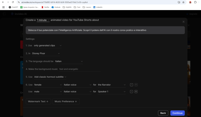 - In questo caso io ho voluto provare a generare un video animato, lasciando come topic il lancio di un corso di intelligenza artificiale. Ho potuto personalizzare i comandi scegliendo lo stile di animazione, la lingua, la musica e persino le voci dei personaggi. Nota: se usi l’opzione gratuita non è detto che tutte le opzioni potranno essere utilizzabili per la generazione del video