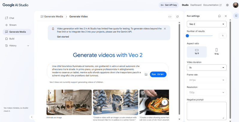 Google AI Studio è una piattaforma sperimentale gratuita che permette di creare e testare modelli generativi basati su intelligenza artificiale. Anche qui, come per Pixverse, permette di creare solo delle scene di pochi secondi, che poi puoi montare in un unico video.