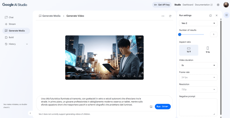 - Nella sezione ‘Generate Media’, poi ‘Veo’ , seleziona la durata del video e quello che non vuoi che venga generato (negative prompts). Inserisci un’immagine di partenza o carica la descrizione della scena. Ho usato sempre il prompt precedente di una città futuristica al tramonto con un ragazzo che guardava un tablet per comparare i risultati.