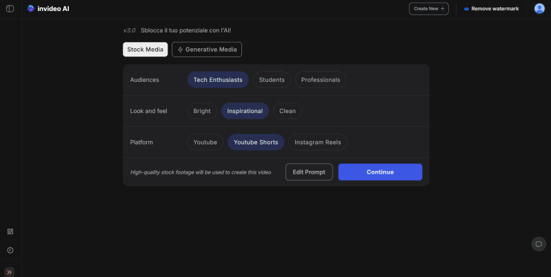 - Per continuare con la versione gratuita seleziona ‘Stock Media’ e inserisci le opzioni relative al pubblico di riferimento, il ‘feeling’ da suscitare e la piattaforma a cui è destinato il video, e clicca su ‘Continue’.