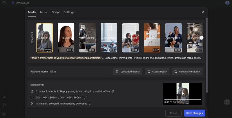 Ho generato il video in pochi minuti e devo dire che la qualità dei media e del voice speaker è davvero notevole; anche lo speech è ben realizzato. Tuttavia, il video non è stato completamente fedele al prompt: avevo chiesto uno stile animato tipo Pixar, ma sono stati utilizzati video reali. Credo che questo dipenda dal fatto che, non utilizzando la versione a pagamento, non ho potuto generare i media personalizzati e il tool ha usato quelli di stock disponibili.
