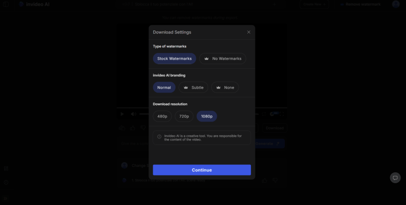 - Una volta salvate le modifiche, potrai effettuare il Download del video. Se usi la versione gratuita nel video apparirà il logo di ‘Invideo’.