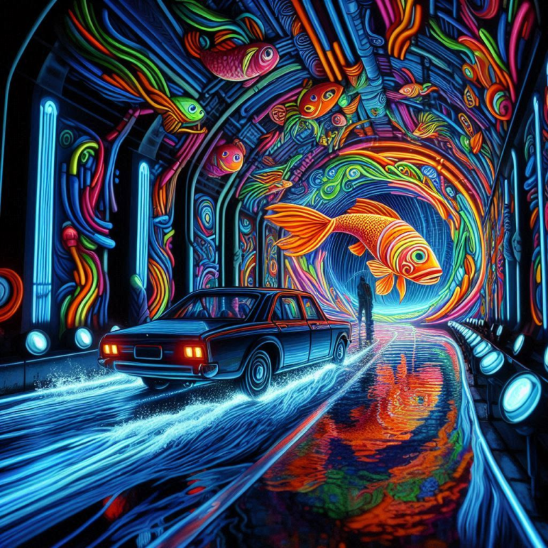 Prompt: ““Dipingi un’auto che si trasforma in un pesce mentre attraversa un tunnel al neon”.