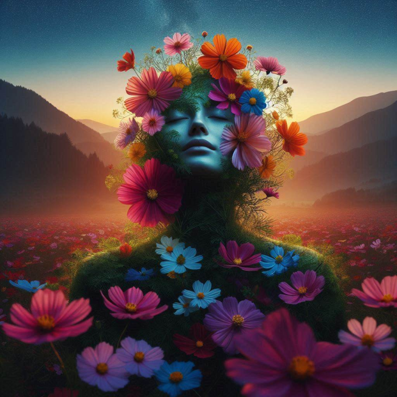 Prompt: “Crea l’immagine di una donna che si fonde nella natura generando bellissimi fiori di ogni colore, che irradia una sensazione di pace e rinascita“