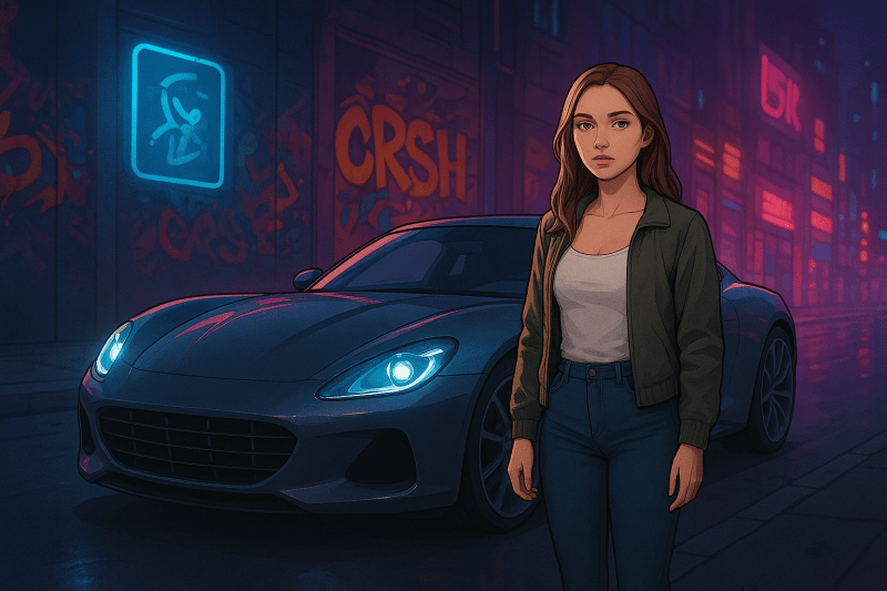 - Combinazione immagini – Ho chiesto di generare una foto di un’auto in primo piano e di inserire la ragazza della foto precedente. Risultato non armonico, ma che si può aggiustare in un paio di prompt. E’ comunque sorprendente.