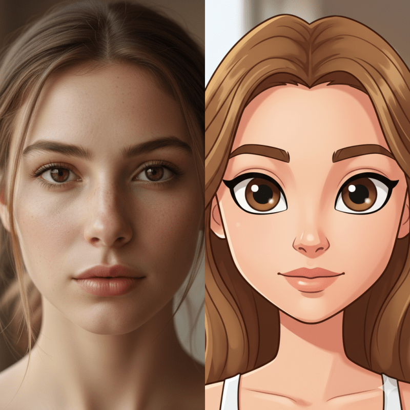 - Cambio stile – Ho chiesto di creare un’immagine di una ragazza reale e poi di trasformarla in una versione cartoon. La foto realistica mi ha sbalordito, la versione cartoon un po’ meno, ma ha rispettato i tratti e i colori originali.